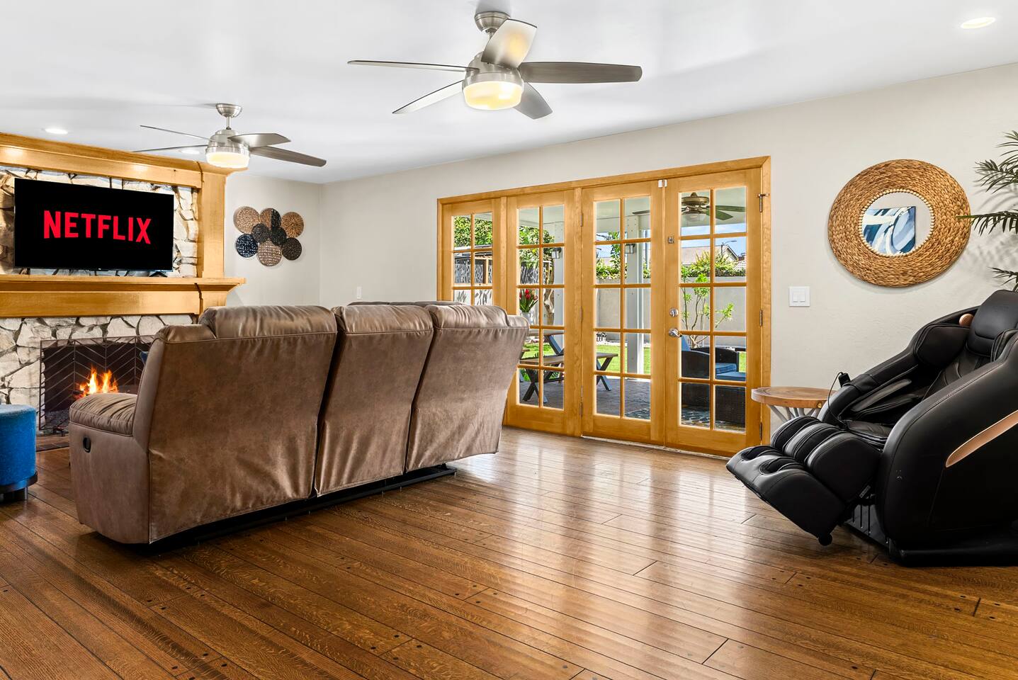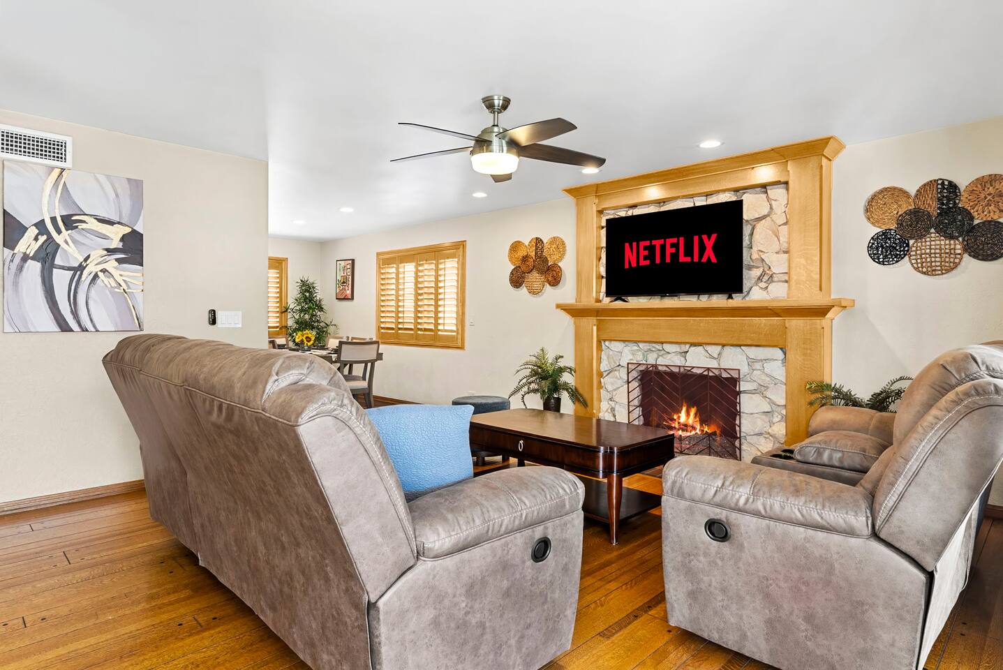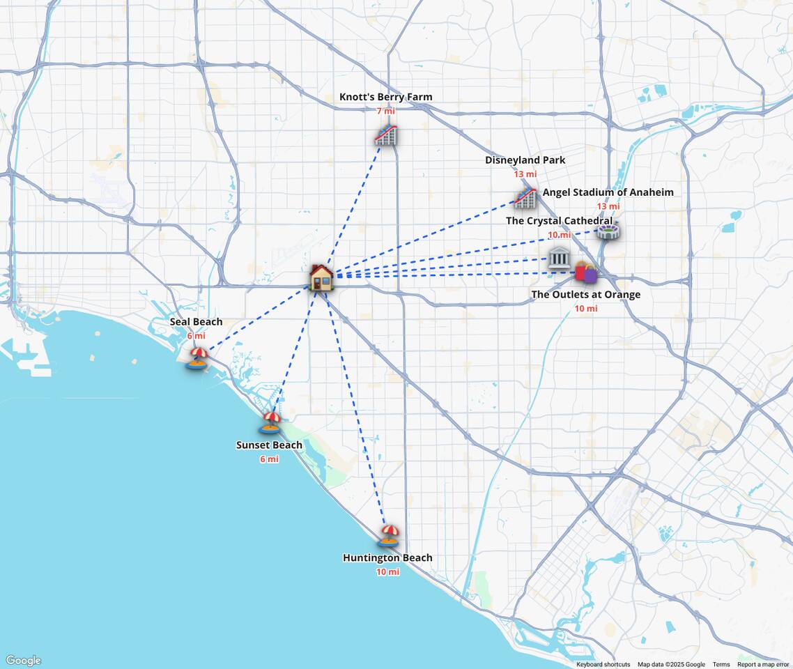 Comfortable Bedrooms (Sleeps 12): 1st Floor: 🛌 Bedroom 1: King bed, 4K TV 🛌 Bedroom 2: Twin bed and bunk bed (twin over full) 🎮 Game room: Pull-out couch 2nd Floor: 🛌 Bedroom 3: Master bedroom with a King bed, 4K TV, dressers, walk-in closet, and work desk with monitor. 🛌 Bedroom 4: Queen bed Amenities: 🎬 Movie theater 🎮 Game room 👕 Laundry area: equipped with a washer & dryer and detergent 🅿️ Parking: 6 spots on the driveway 👶 Pack & Play 🍽️ High chair Nearby Attractions: 🎢 Knott’s Berry Farm – 7 miles 🏰 Disneyland Park – 13 miles ⚾ Angel Stadium of Anaheim – 13 miles 🐠Aquarium of the Pacific – 10 miles 🛍️ The Outlets at Orange – 10 miles 🕌 The Crystal Cathedral – 10 miles 🌊 Seal Beach – 6 miles ☀️ Sunset Beach – 6 miles 🏄♂️ Huntington Beach Pier – 10 miles 🎬 Hollywood – 40 miles 🦁 Los Angeles Zoo – 40 miles